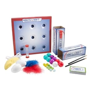 Bring the hit NBC game show, Minute To Win It, off the television and right into your living room. This deluxe version of the game includes cards with simple, hilarious and nerve-wrecking tasks players need to complete in under a minute. Mix and match the included props -- like a banana, string and ping pong balls -- along with everyday household items to win it. The game includes 300 challenge cards, plastic balls, feathers, foam eggs, a cotton handkerchief, sand timer, pedometer, elastic head band, plastic banana, hoop and more.